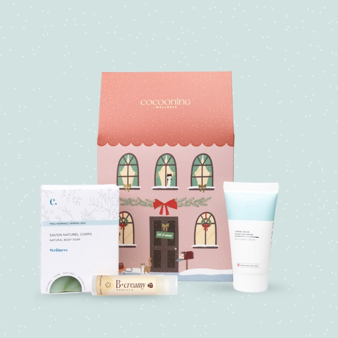 Verziert mit kleinen neugierigen Katzen an den Fenstern, enthält diese Geschenkbox drei essentielle Pflegeprodukte für den Alltag: