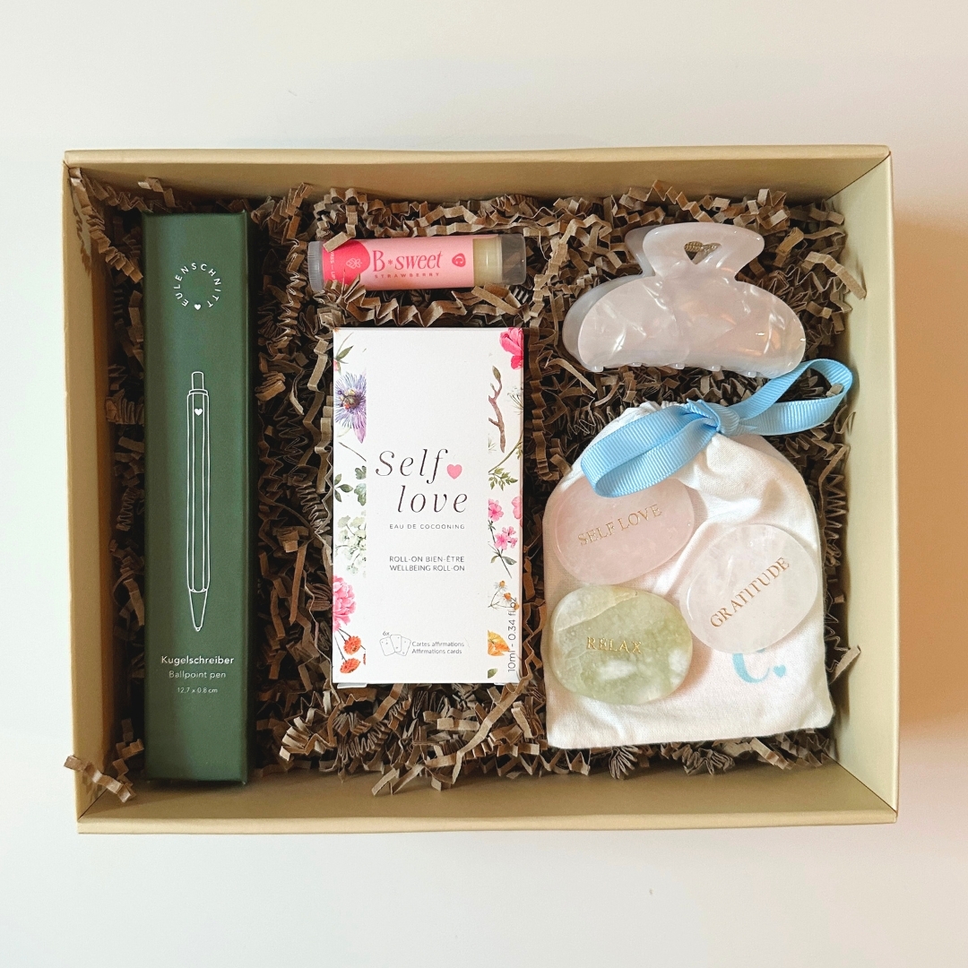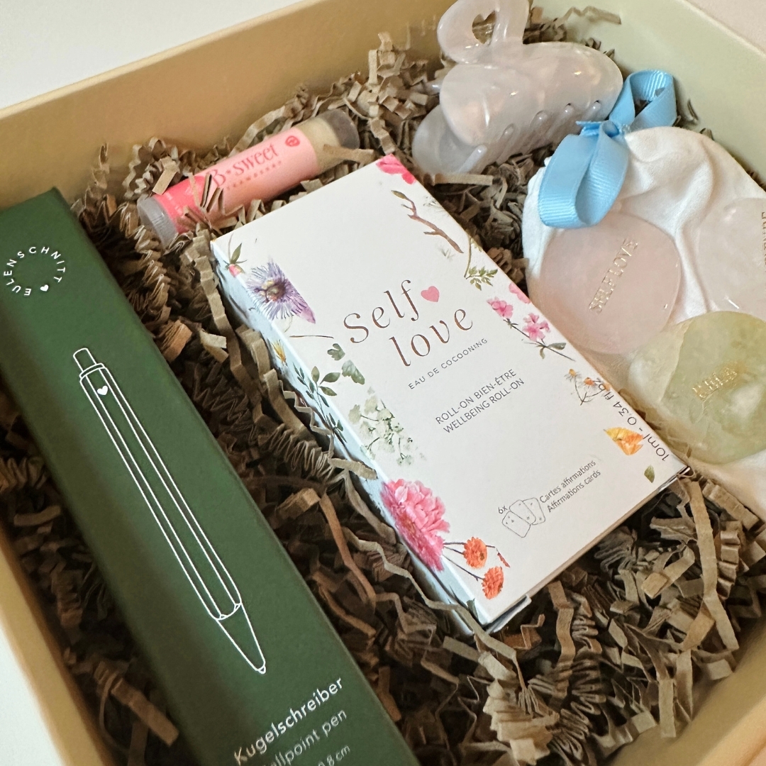 Die Geschenkbox Gratitude wurde für Menschen geschaffen, die mehr Achtsamkeit, Selbstliebe und Dankbarkeit in ihren Alltag bringen möchten. Sie enthält ein gemütliches Notizbuch für Gedanken und kleine Glücksmomente, einen stylischen grünen Stift, einen Self-love Roll-on mit Visualisierungskarten für stärkende Affirmationen, einen pflegenden Lippenbalsam mit Kakaobutter, drei gravierte Steine mit den Worten self-love, gratitude und relax sowie eine hübsche Haarspange, die jedem Look einen feinen Akzent verleiht. Ein liebevolles Geschenk, um Übergänge zu begleiten, kleine Erfolge zu feiern und sich immer wieder eine achtsame Pause nur für sich selbst zu schenken. Sie erinnert daran, kurz innezuhalten, tief zu atmen und das Gute zu sehen.