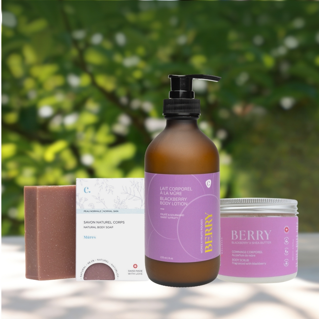 Entdecken Sie Rituel Mûres, ein komplettes Körperpflege-Set mit dem fruchtigen und wohltuenden Duft von Brombeeren. Es vereint 3 unverzichtbare Pflegeprodukte für eine einfache und sinnliche Routine: ein Körperpeeling, das die Haut sanft exfoliert, eine Seife zur schonenden Reinigung und eine Körpermilch, die die Haut pflegt, geschmeidig macht und dezent parfümiert. Dieses Trio verwandelt die Körperpflege in einen echten Cocooning-Moment und lässt Sie Ihren Lieblingsduft in einer vollständigen Pflegeroutine wiederentdecken. Ideal, um sich selbst eine Freude zu machen oder als Geschenk.