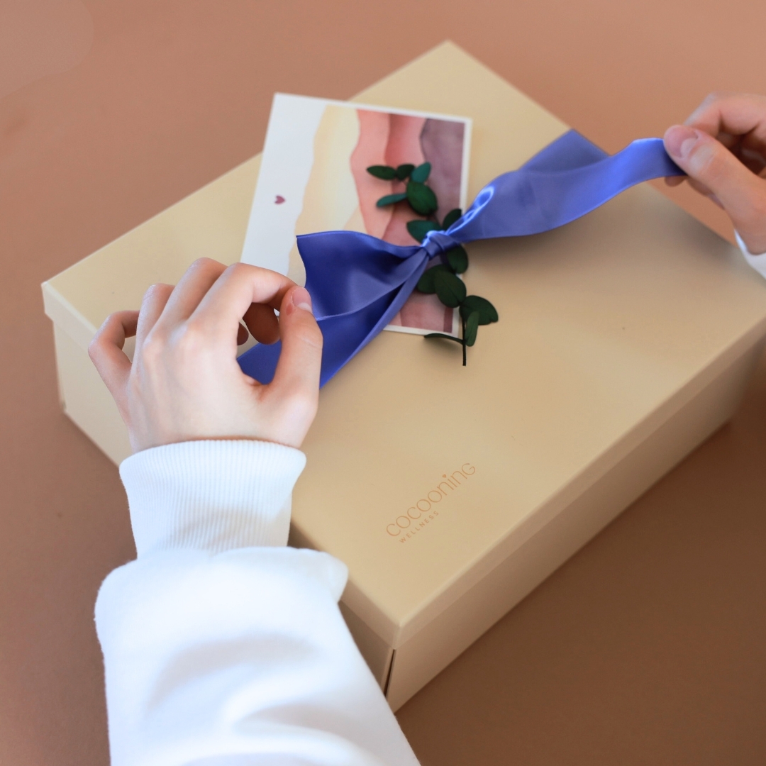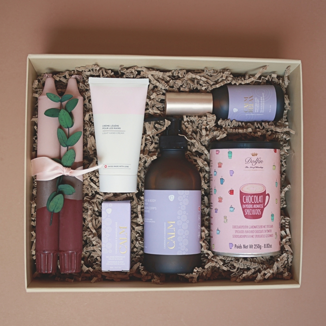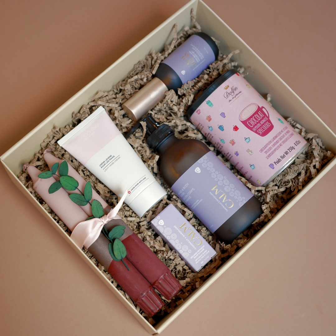 The **Merci pour tout Gift Box** is a true bubble of serenity. It brings together everything needed for a soothing moment at home: two candles for a calming glow, a Calm liquid soap and a gentle hand cream, a blend of essential oils to diffuse peaceful vibes, and a tin of speculoos cocoa for a comforting, gourmet touch.