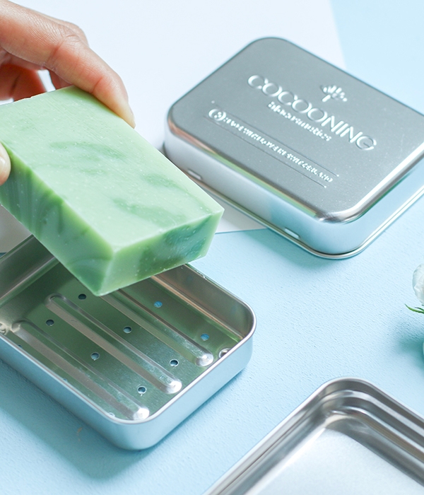 Lightweight aluminum with an inner soap tray that keeps your soap dry. A unique Cocooning design, perfect for travel or for keeping your soap at home.